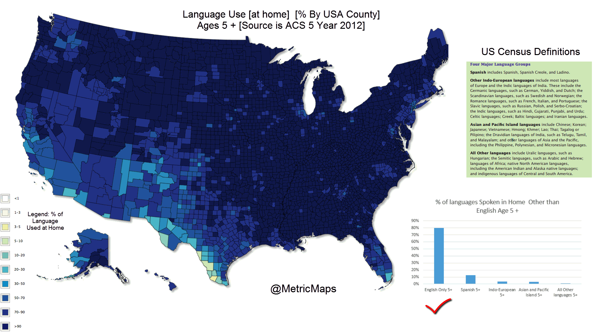 The Washington Post wrote this week about the languages we speak at home, measured at the county level across the United States. While about 80 percent of U.S. households are English speaking, there are large pockets of households with other dominant languages.